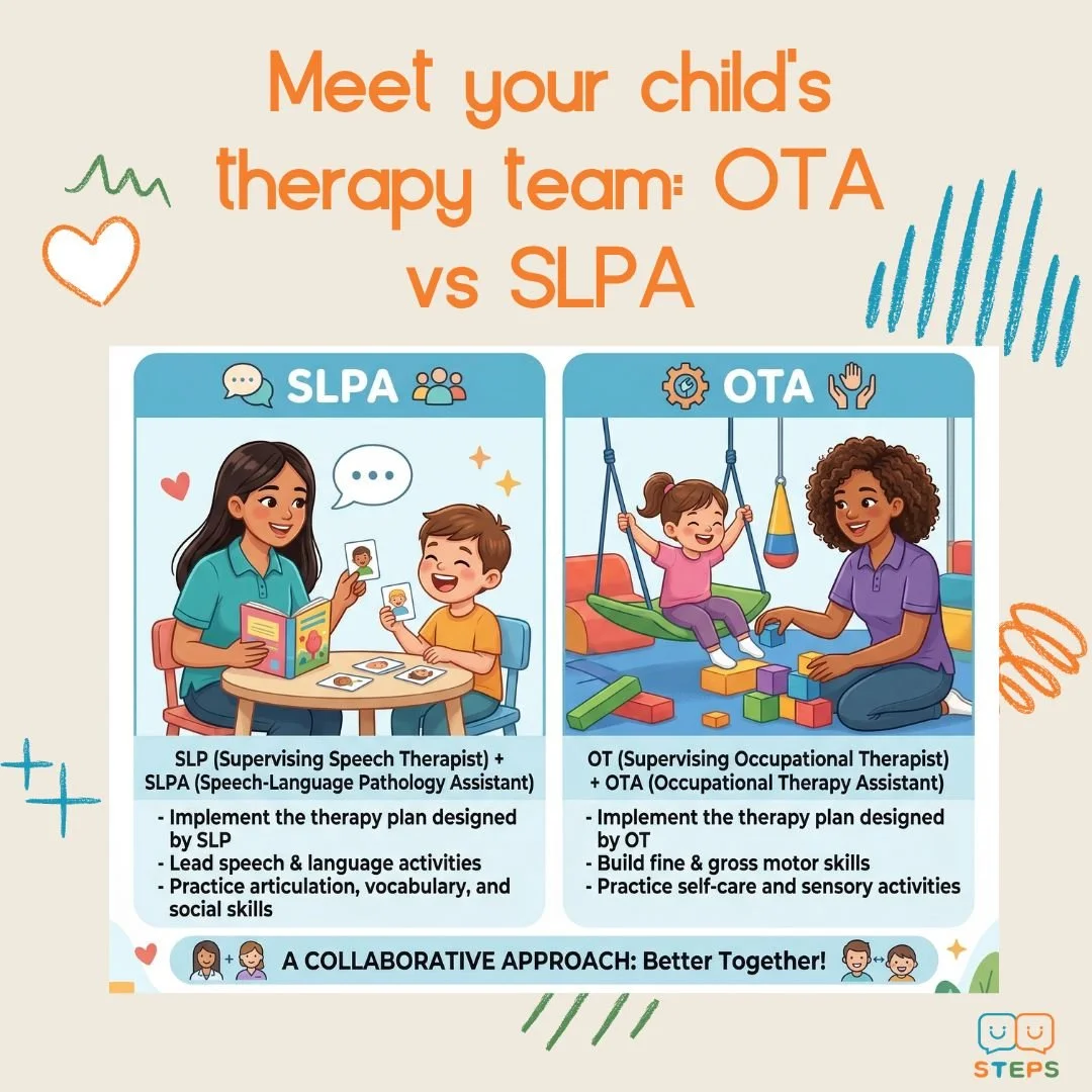 When your child starts therapy, you may notice there are several professionals involved in their care. You might hear titles like SLP, SLPA, OT, or OTA, and wonder who everyone is and what their role is in your child’s progress.