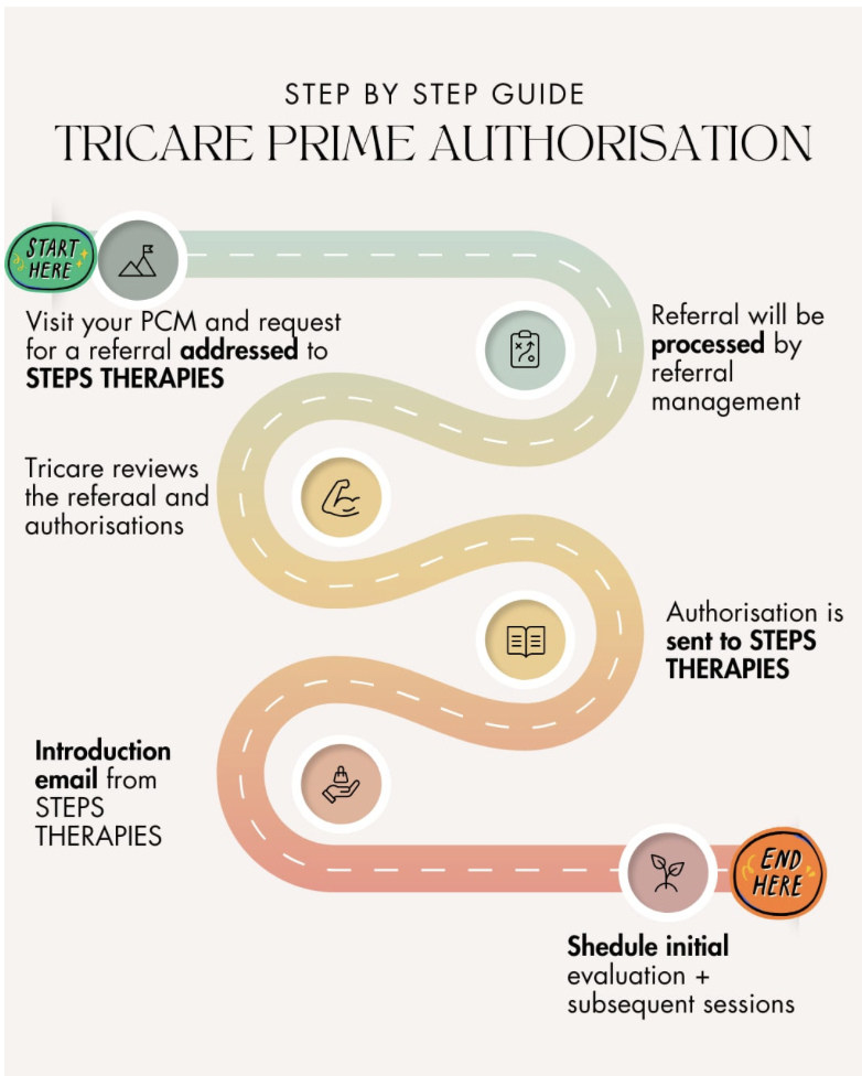 A: If you have Tricare Prime, a referral/authorization from your Primary Care Doctor is required. After your doctor issues the referral, it will be processed by referral management. Tricare will then review the referral and authorizations. Once STEPS THERAPIES receives this authorization, we can begin the initial evaluation process and schedule subsequent sessions.